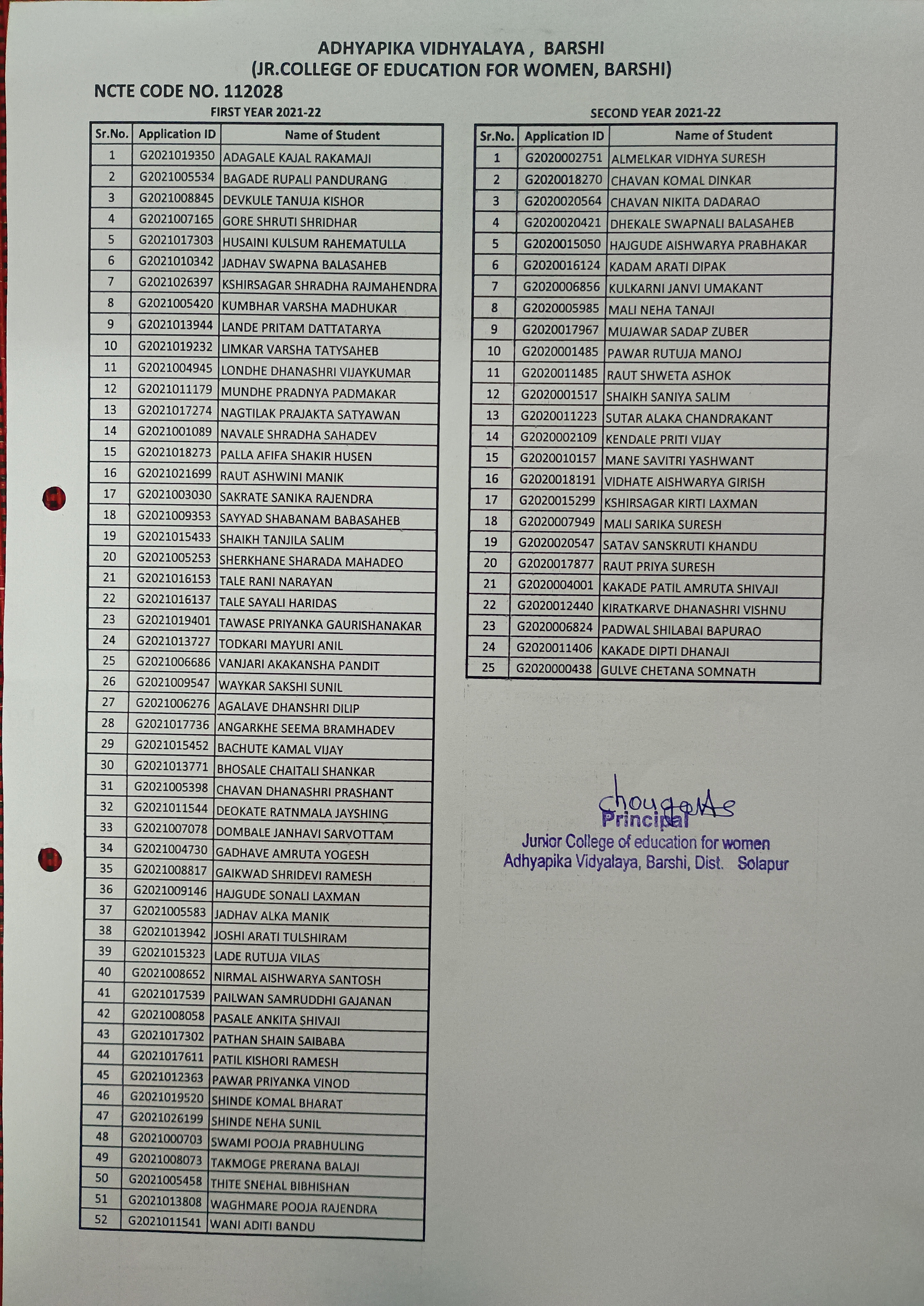 Junior College of Education,(Women). NCTE code: 112028(M)